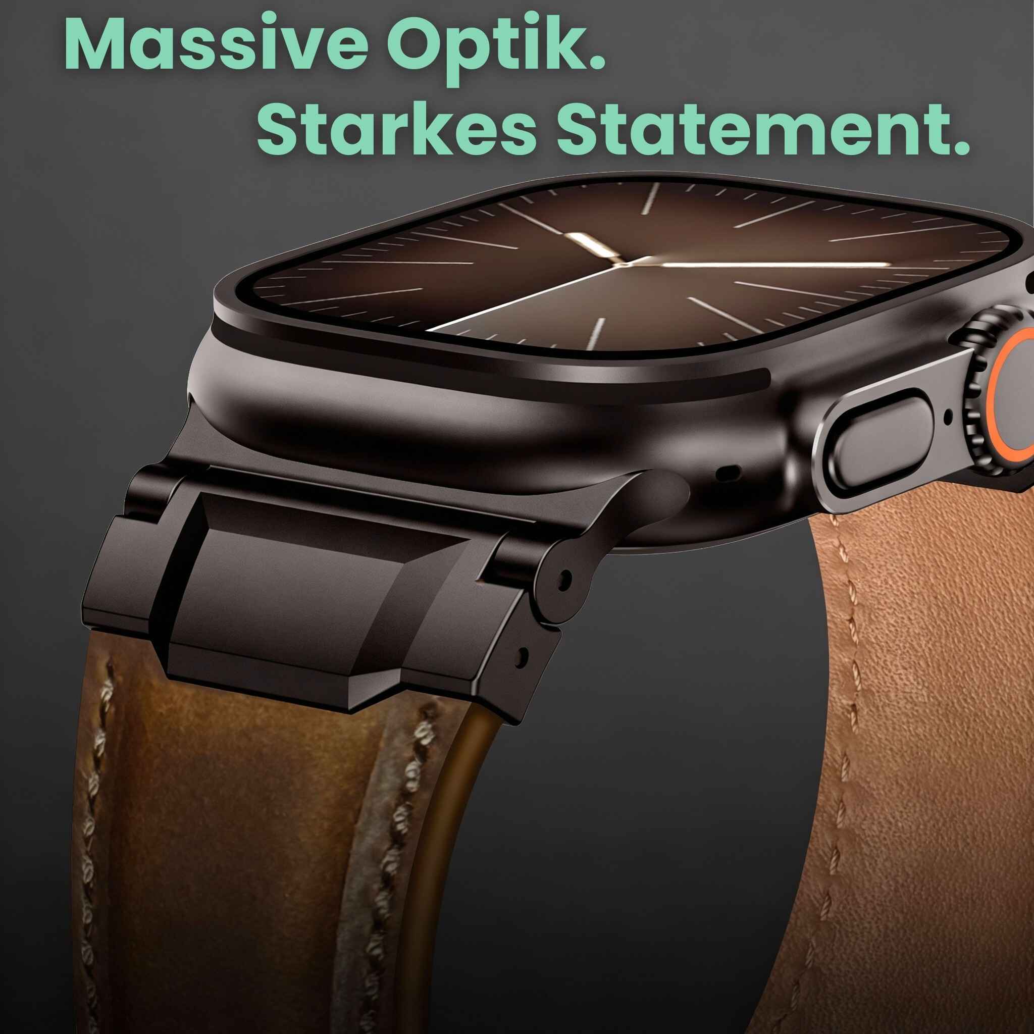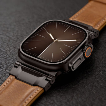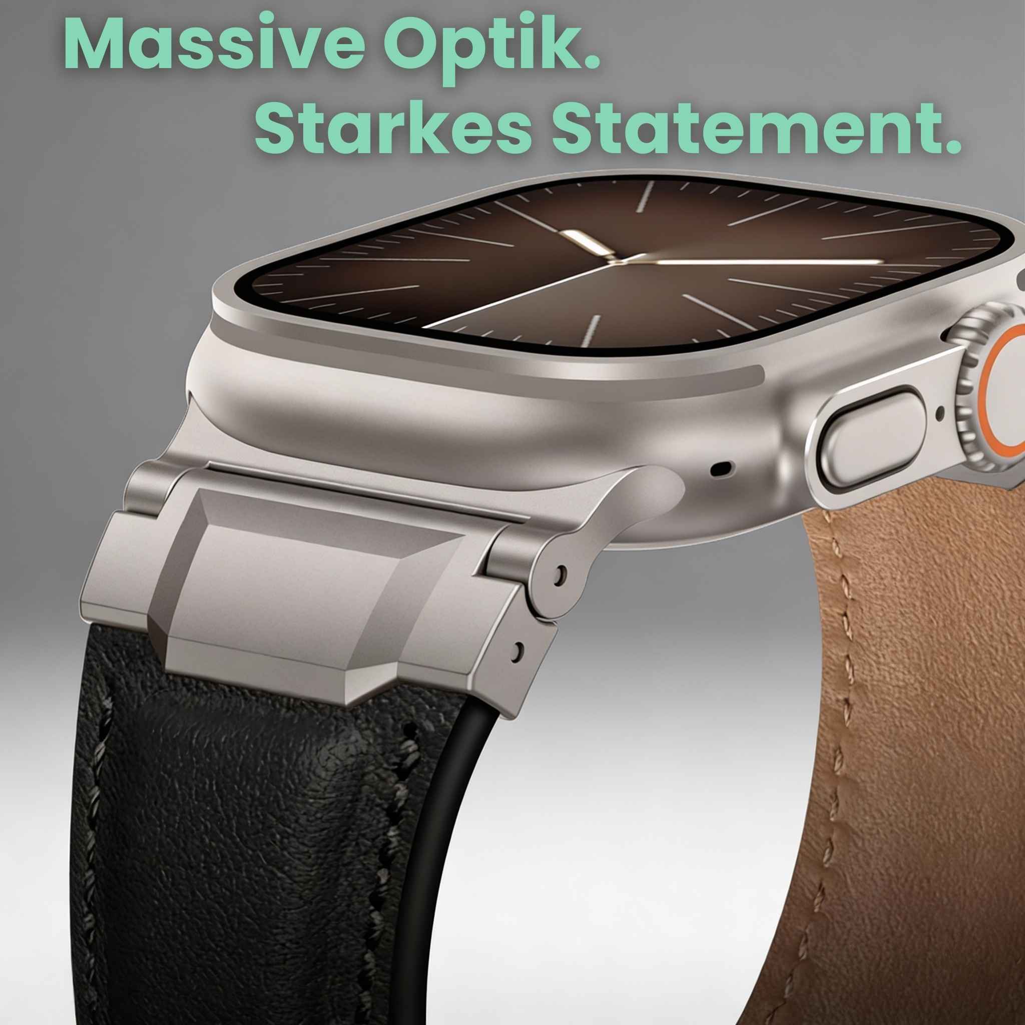 Viele Standard-Lederbänder wirken an der großen Apple Watch Ultra oft zu schmal und verloren (der sogenannte "Lollipop-Look"). Unser spezieller "Mecha"-Connector verbreitert den Anstoß optisch auf 26 mm, um einen fließenden, massiven Übergang zu schaffen, der dem robusten Design der Uhr gerecht wird.