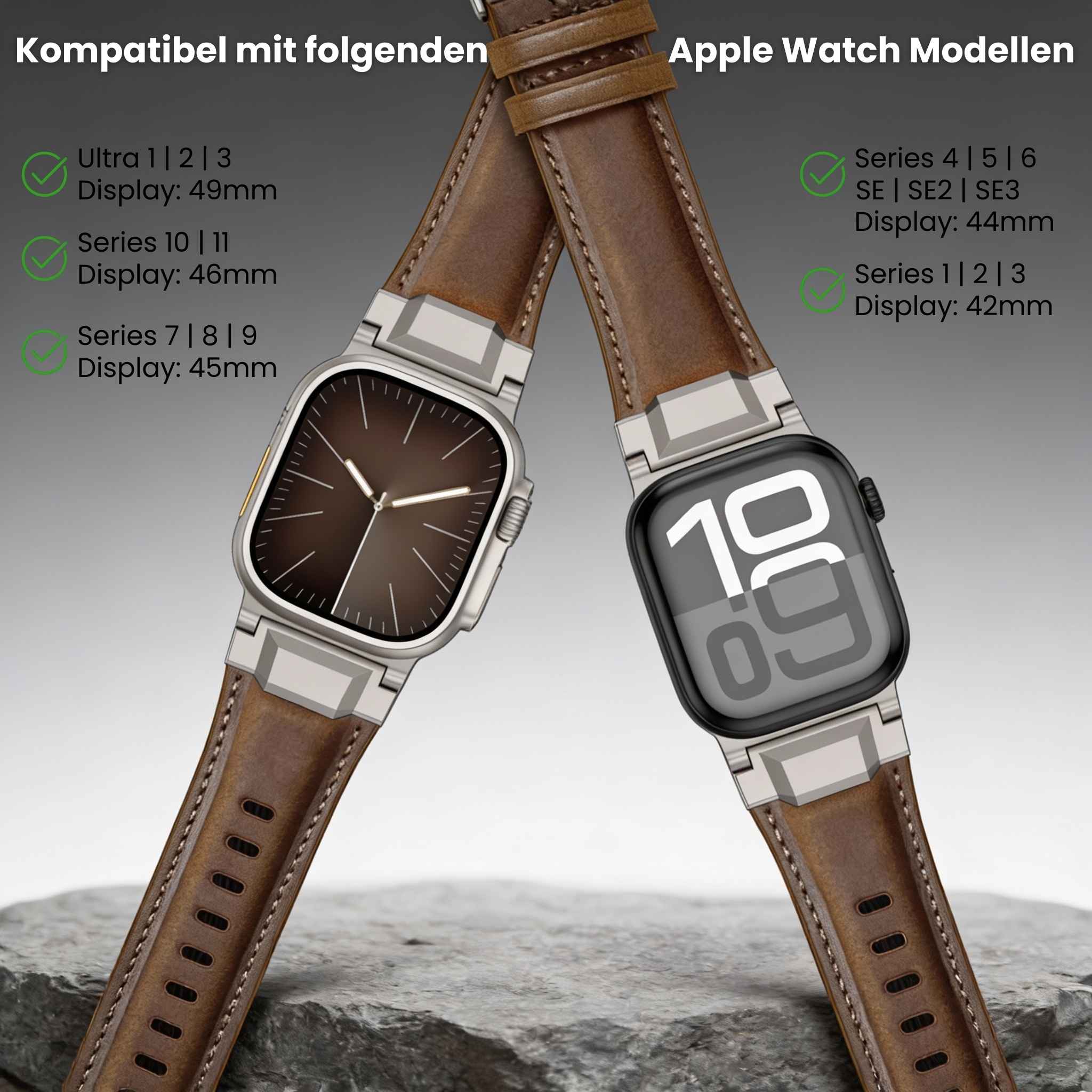 Ja, absolut! Das Lederarmband "Rom" wurde speziell für die großen Gehäusegrößen entwickelt. Es passt perfekt an die Apple Watch Ultra (alle Modelle), die Series 11 & 10 in 46 mm sowie alle älteren Modelle mit 45 mm, 44 mm und 42 mm Gehäuse.